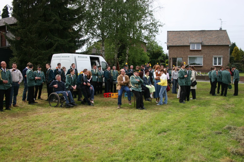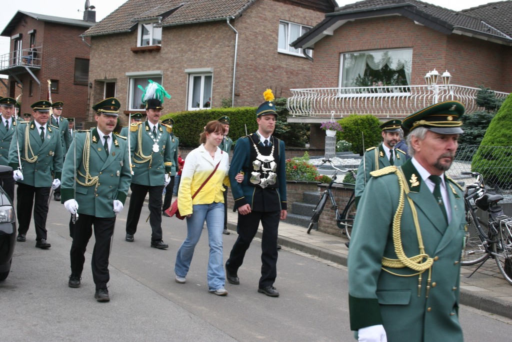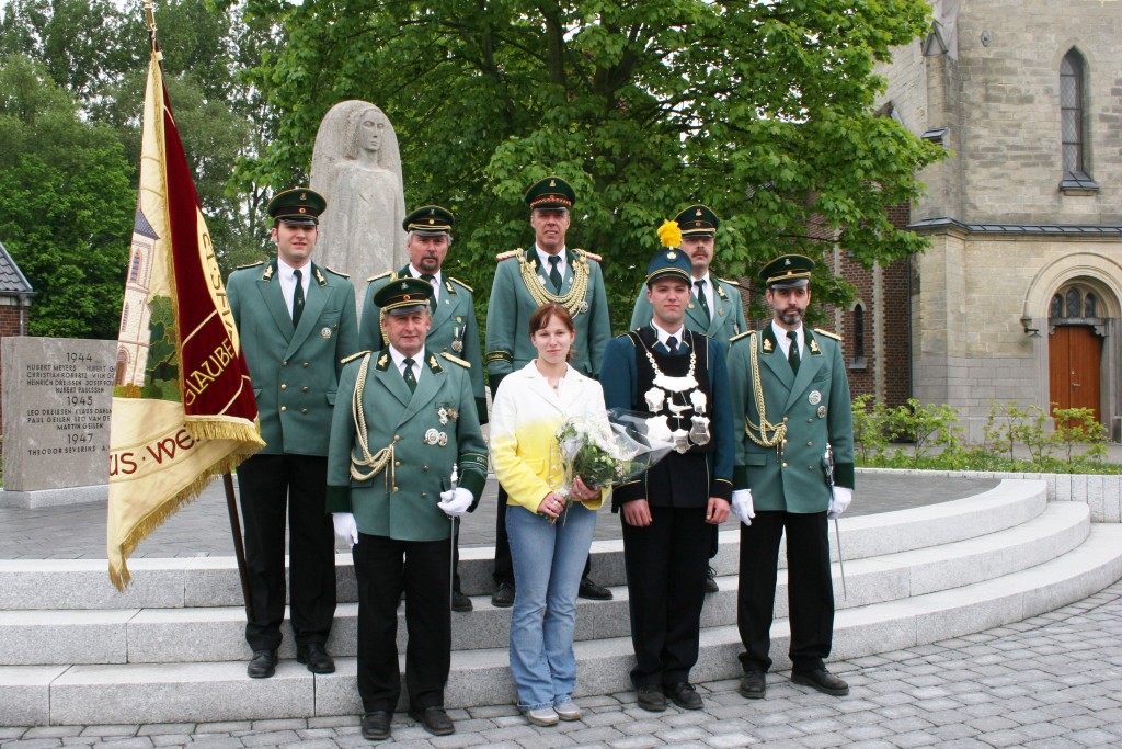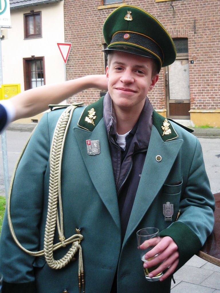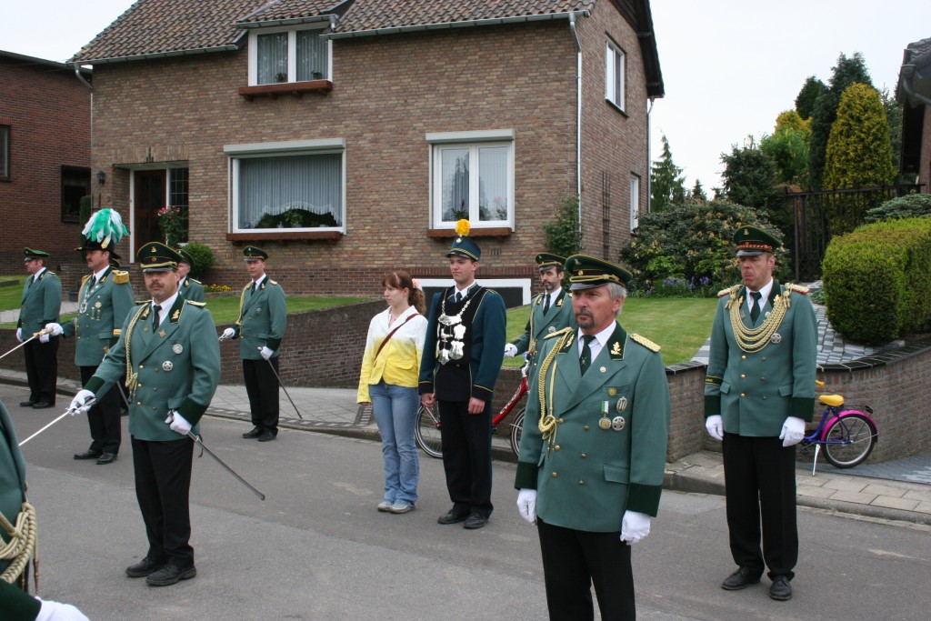 Königsvogelschuß 2006Präsident Georg Wagemans errang die Königswürde24. Mai 2006 - Mit Unterbrechungen wurde der diesjährige Wettbewerb auf der Festweise in Wehr durchgeführt. Einzelne Regenschauer gaben den Schützen jeweils etwas Zeit, sich zu dem nächsten Durchgang neu zu formieren. Der Vorstand wollte die Veranstaltung schon abbrechen, doch dann formierte sich wieder eine Gruppe und legte zum Endkampf an. Nur vereinzelt reihten sich Schützenbrüder in die Reihen der Schützen ein, die überwiegend der Spielmannszug stellte. Als der Jubel erhallte, war es Georg Wagemans, der dem Königsvogel den entscheidenden Schuß verpasst hatte. Nach der Parade versammelte man sich dann zum gemütlichen Teil im Dorfzentrum, wo der neue Schützenkönig noch würdig und lange gefeiert wurde.