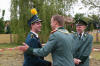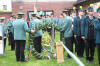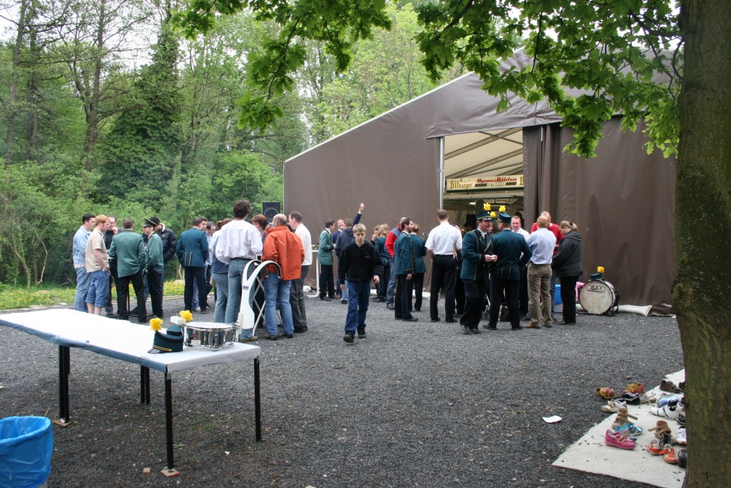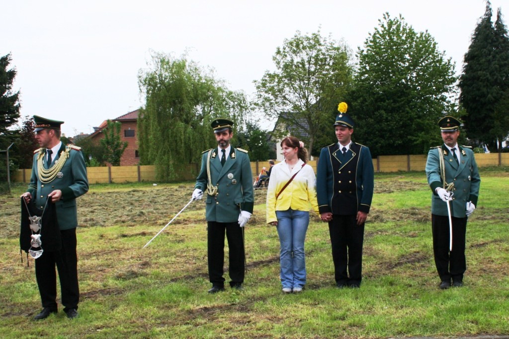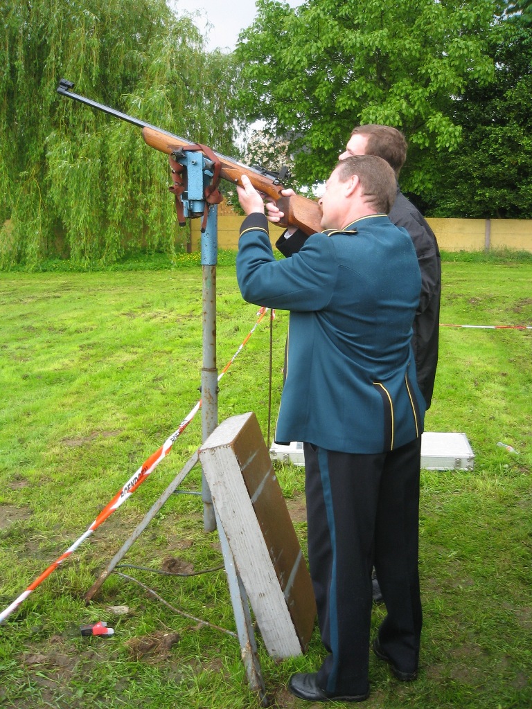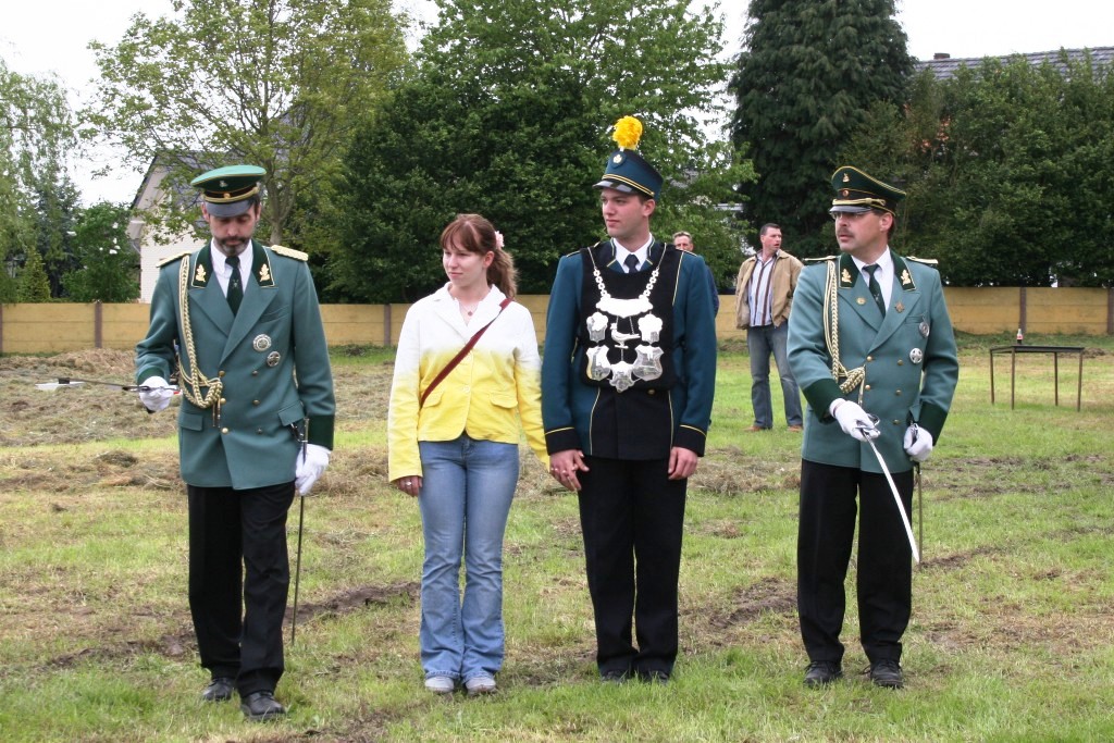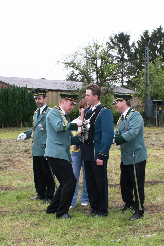 Königsvogelschuß 2006Präsident Georg Wagemans errang die Königswürde24. Mai 2006 - Mit Unterbrechungen wurde der diesjährige Wettbewerb auf der Festweise in Wehr durchgeführt. Einzelne Regenschauer gaben den Schützen jeweils etwas Zeit, sich zu dem nächsten Durchgang neu zu formieren. Der Vorstand wollte die Veranstaltung schon abbrechen, doch dann formierte sich wieder eine Gruppe und legte zum Endkampf an. Nur vereinzelt reihten sich Schützenbrüder in die Reihen der Schützen ein, die überwiegend der Spielmannszug stellte. Als der Jubel erhallte, war es Georg Wagemans, der dem Königsvogel den entscheidenden Schuß verpasst hatte. Nach der Parade versammelte man sich dann zum gemütlichen Teil im Dorfzentrum, wo der neue Schützenkönig noch würdig und lange gefeiert wurde.