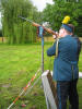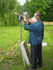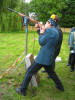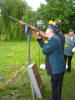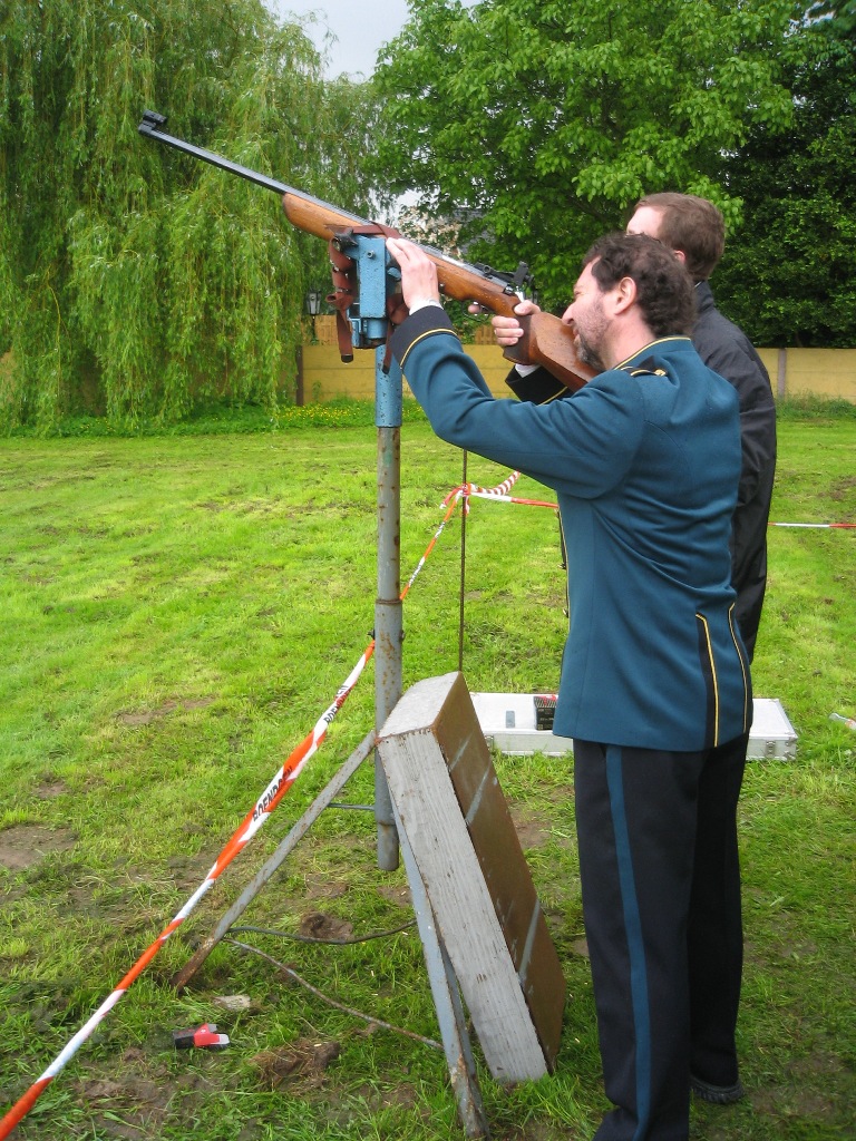 Königsvogelschuß 2005Kevin Bex ist der neue Würdenträger der St. Severinus Schützenbruderschaft Wehr.5. Mai 2005 - Bereits um 13:30 Uhr mussten sich Spielmannszug und Schützenbruderschaft heute am Dorfzentrum einfinden und zum traditionellen Vogelschuß antreten. Nach einer kurzen Andacht zog man dann zur Schützenwiese, wo der Königsvogel schon bereit stand. Aus witterungstechnischen Gründen wichen die Verantwortlichen von einigen Traditionen ab; der Königsvogel stand diesmal sehr einsam auf der Schützenwiese, weil die üblichen Einrichtungen für das Wehrer Wiesenfest diesmal von der Wiese ins Pfarrheim verlegt worden waren. Auch der Wettkampf um den Schülerprinzen wurde kurzfristig mangels Teilnehmer gestrichen, sodass nach den Ehrenschüssen der Wettkampf gleich eröffnet wurde. Nach und nach fanden sich dann einige Interessenten, die reihum dem Königsvogel zusetzten. Mit dem 195 Schuß setzte Kevin Bex dann dem Wettkampf ein Ende und holte den verbliebenen Rumpf des Königsvogels mit einem gezielten Schuß von der Stange.