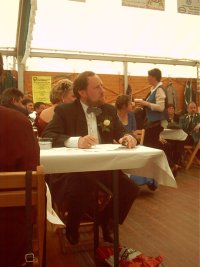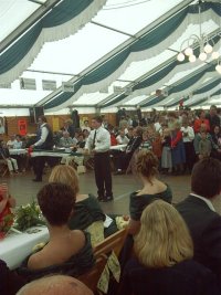Den Ehrengästen und vielen Zuschauern bot sich hierbei ein farbenprächtiges und stimmungsvolles Bild. Nachdem die Bruderschaft aus Stahe Niederbusch mit der Nummer 24 als letzte an der Festbühne vorbeigezogen war, holte der Spielmannszug Wehr Ehrengäste und Majestäten ab und geleitet sie zum Festzelt. Hier führte dann Dekanatsbundesmeister Heinrich Aretz in gewohnter und gekonnter Manier Regie. Überfüllt war das große Festzelt an der Severinusstrasse, als die Fahnenschwenker ihren Wettkampf austrugen.