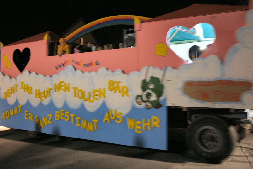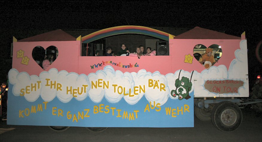 Karneval in Wehr 2005Am Freitag Abend ( 04. Februar 2005 ) präsentierten sich die Wehrer Jecken im eigenen Dorf mit einem kleinen Umzug und stellten damit ihre diesjährigen Gruppen der Dorfbevölkerung vor. Viele interessierte Zuschauer, wie bei den großen Umzügen im Selfkantkreis, gab es nicht. Für diejenigen, die den Umzug verpasst haben, hier ein paar Schnappschüsse von den Glücksbären und den Zwergen. Wer die Gruppen noch in einem großen Umzug bewundern möchte, kann sie am Rosen-Montag in Tüddern bewundern. Weitere Informationen findet Ihr noch unter www.karnevalinwehr.de